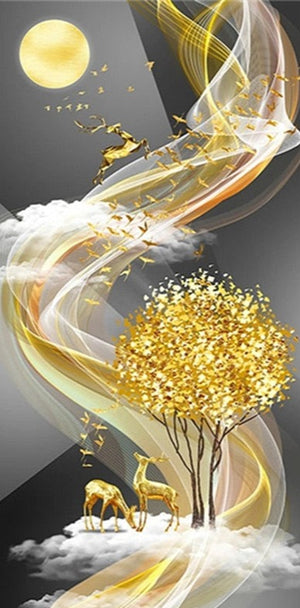 Dazzling Golden Montage Of Deer Under A Glistening Tree And Brilliant Moon - Full Round/Square Drill Diamonds - Abstract Diamond Painting Kit - This Design Is Perfect For Large Canvases!