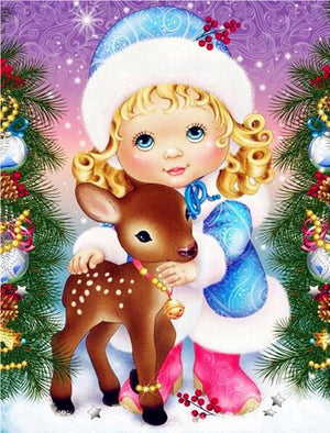 - Cartoon Girl With Fawn | Christmas Diamond Painting | Full Round/Square Drill 5D Rhinestones | DIY Holiday Kit