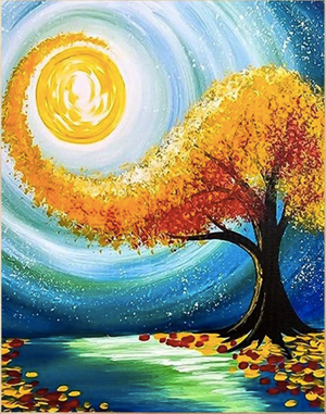 Colorful Abstract Tree With Fall Leaves Swirling Around A Beautiful Sun - Full Round Or Full Square Diamonds - Autumn Diamond Painting