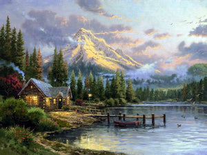 Lakeside Chalet With Smoking Chimney On A Placid Lake - Scenic Rhinestone Embroidery Full Square / Round Drill 5D Diamonds - DIY Scenic Diamond Painting Displaying Amazing Home And Water View Scenery - Available On Full Pasting Area In Several Painting Canvas Sizes - DIY Diamond Kit - Perfect For Any Home Or Office Decor
