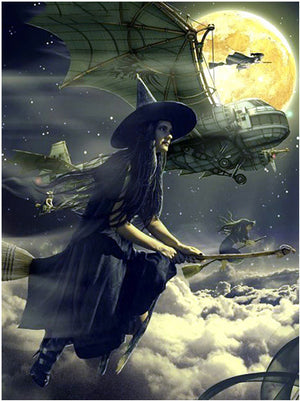 Witches On Brooms Flying At Night Under A Full Moon - Is That A Witch Airplane Flying With Them? Spooky Halloween Diamond Painting Kit - Full Round/Square Diamonds On Full Pasting Area