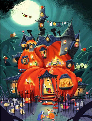 Add A Pumpkin And A Haunted House Diamond Painting Together And You Get A....Haunted Pumpkin House - Who Wouldn't Just Love To Trick Or Treat This Home - Full Of Standard Halloween Symbols That We All Know And Love Like Ghosts And Bats And Broomsticks This Halloween Diamond Painting Screams BOO! Square Drill 5D Rhinestones On Full Pasting Area - Add This DIY Diamond Kit To Your Home For Some Holiday Fun